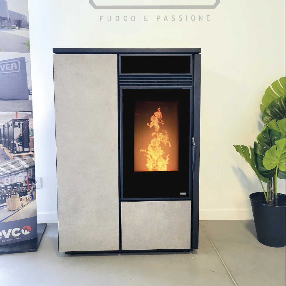 Poêle à pellets avec ventilation désactivable. De série : Télécommande thermostatique, brasier auto-nettoyant et commande à distance par Wi-Fi.